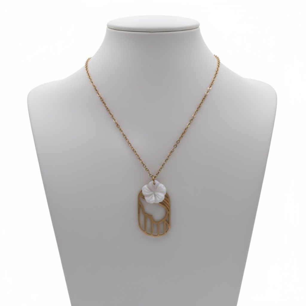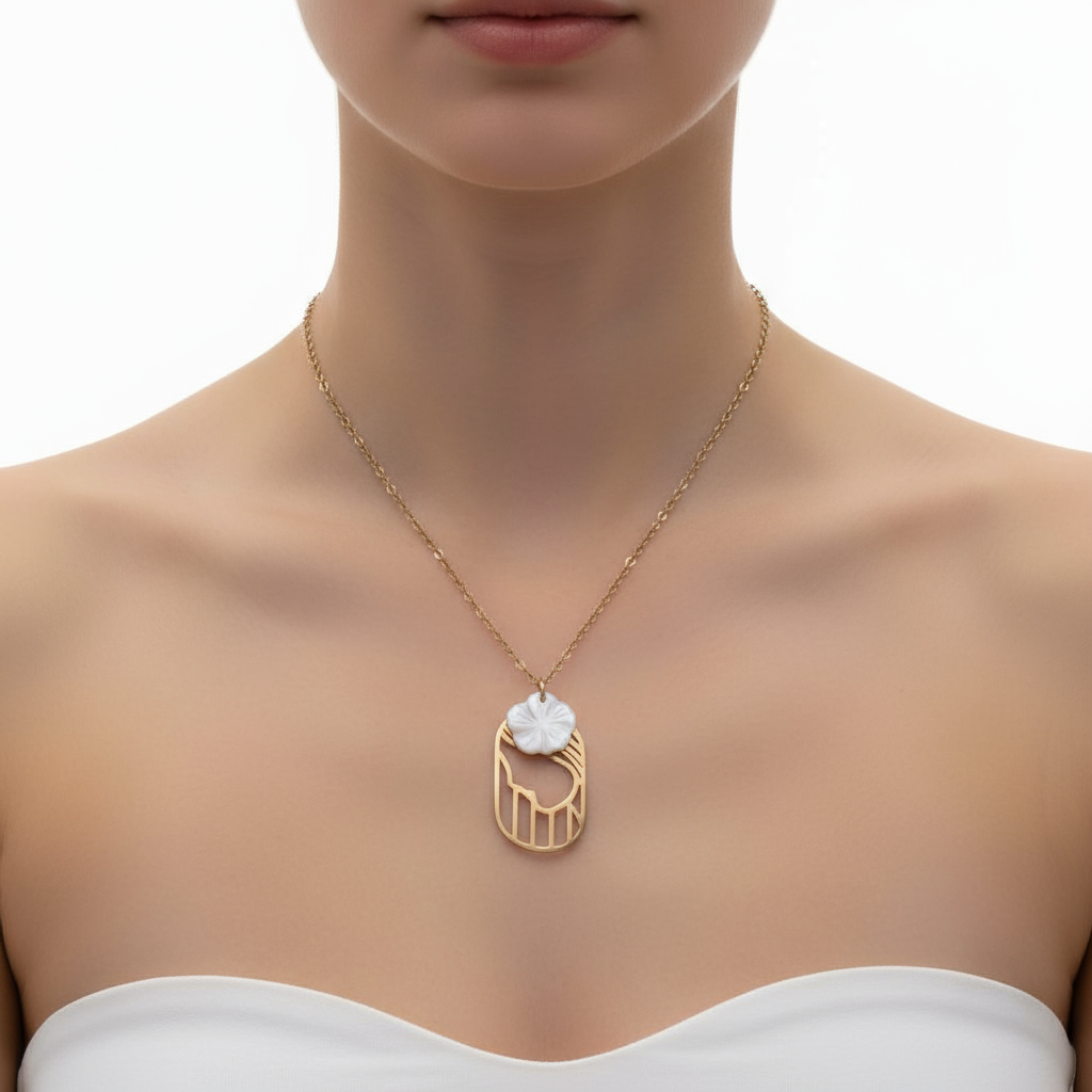 La collection Alaya est une invitation au raffinement et à l'élégance contemporaine. Chaque pièce met en valeur une harmonie subtile entre lignes géométriques et douceur florale, incarnée par un pendentif ajouré en finition dorée, rehaussé d'une délicate fleur blanche taillée avec finesse.
